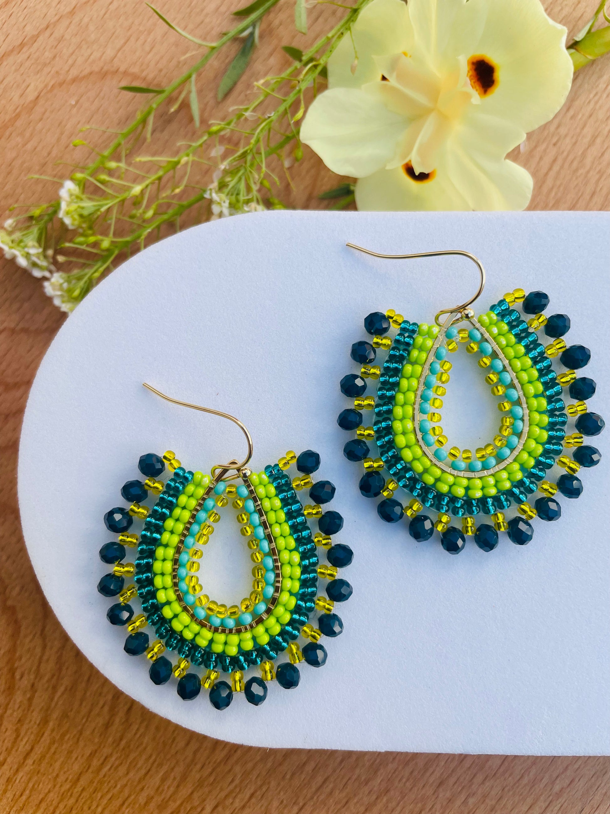 Vibrant teardrop earrings handcrafted with layered lime, teal and gold beads bold, bright and beautifully lightweight. Make a statement every day