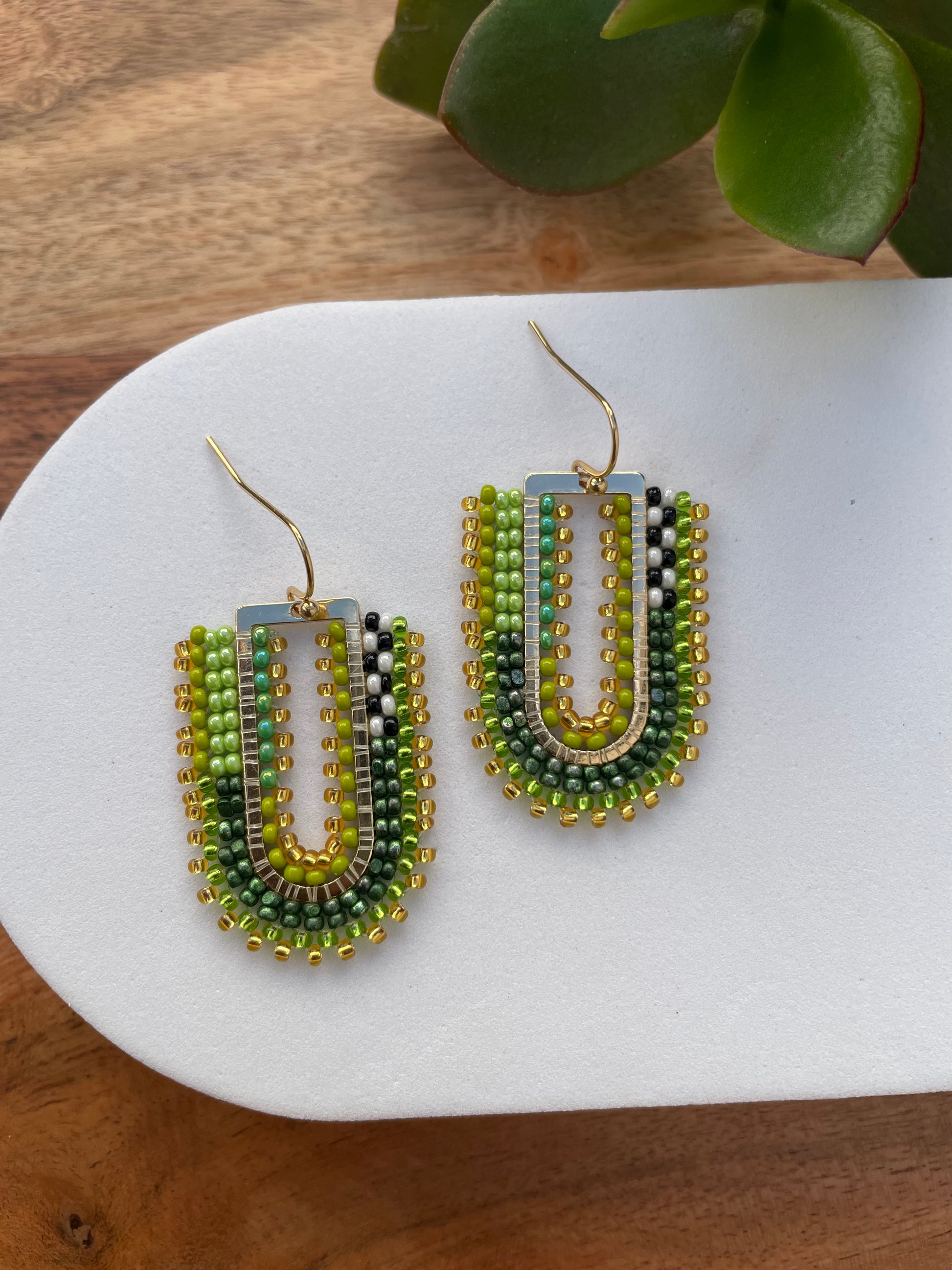 Green is so easily to fall in love with. This earring is a celebration of Green. From deep forest greens to a touch of acid limes. Made with tiny seed beads.