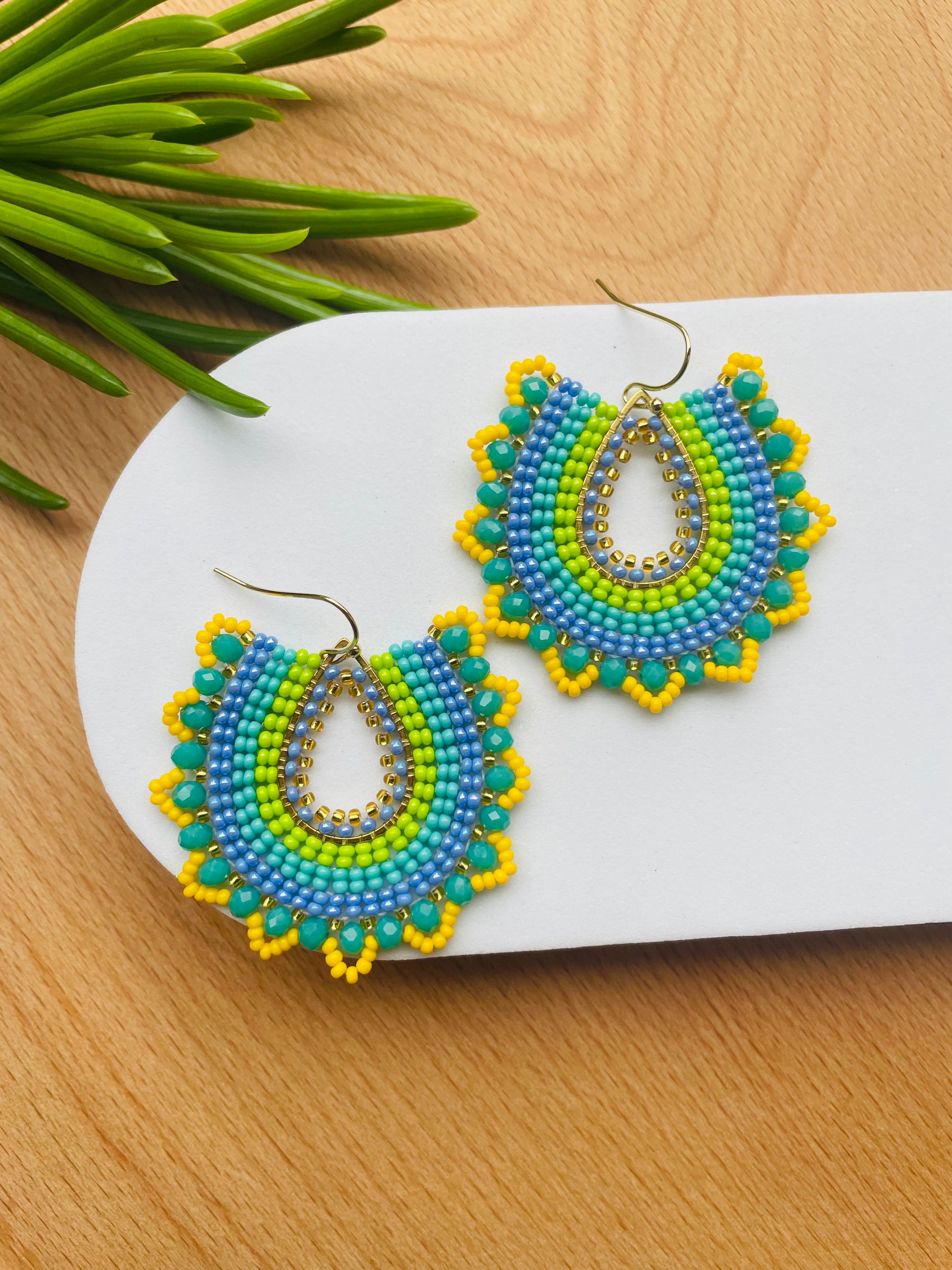 A radiant burst of colour and craftsmanship. The Indi Earrings are a celebration of freedom and joy! vivid yellow, turquoise, lime green, and soft blue beads come together in a mesmerising teardrop design. Each pair is meticulously handcrafted, layered bead by bead, creating a piece that feels both playful and powerful.