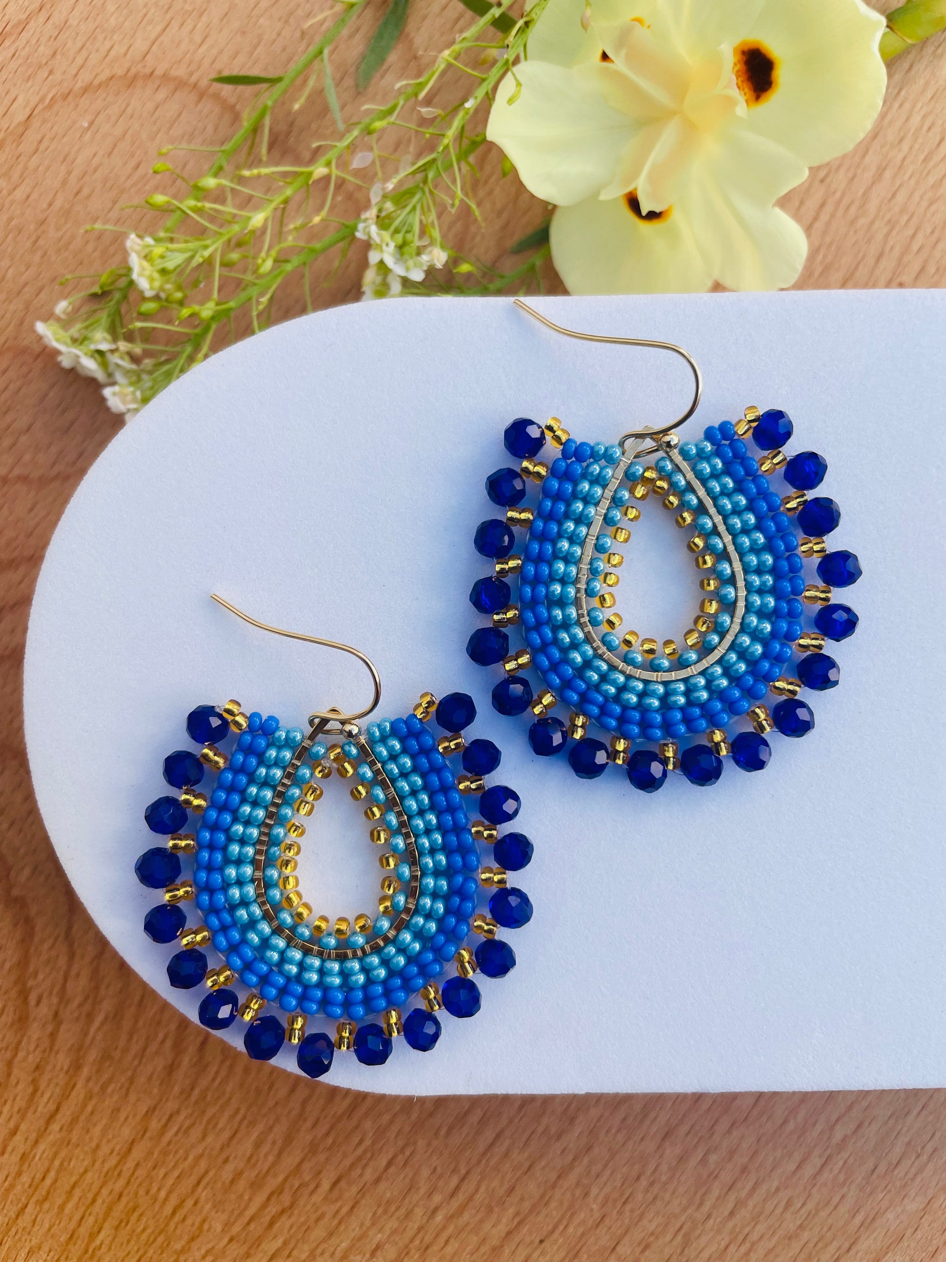 Jaw dropping gorgeous!! Deep tones of blue and gold with highlights of gold beads. These earrings were made to turn heads and start conversations.
