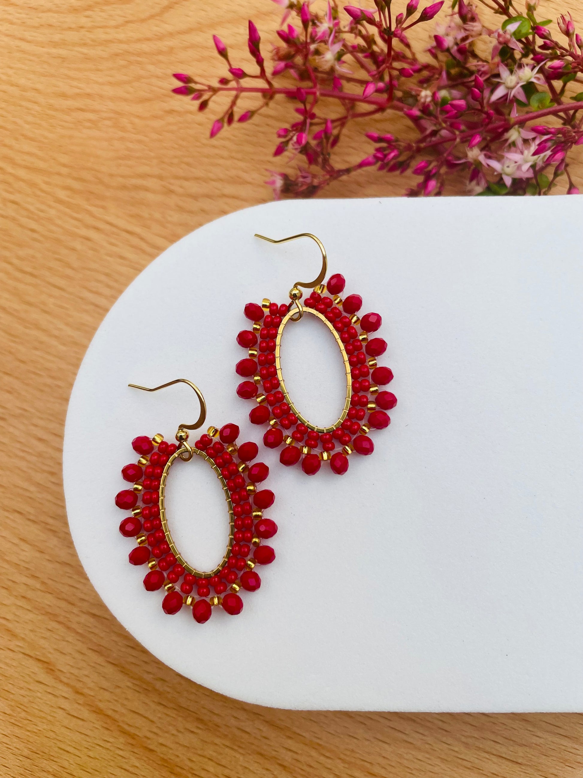Bold, fiery and utterly captivating the Jill Earrings are designed to turn heads. Rich deep red beads are intricately woven with radiant gold accents, creating a look that feels both powerful and luxurious. These earrings carry an air of confidence and timeless beauty.