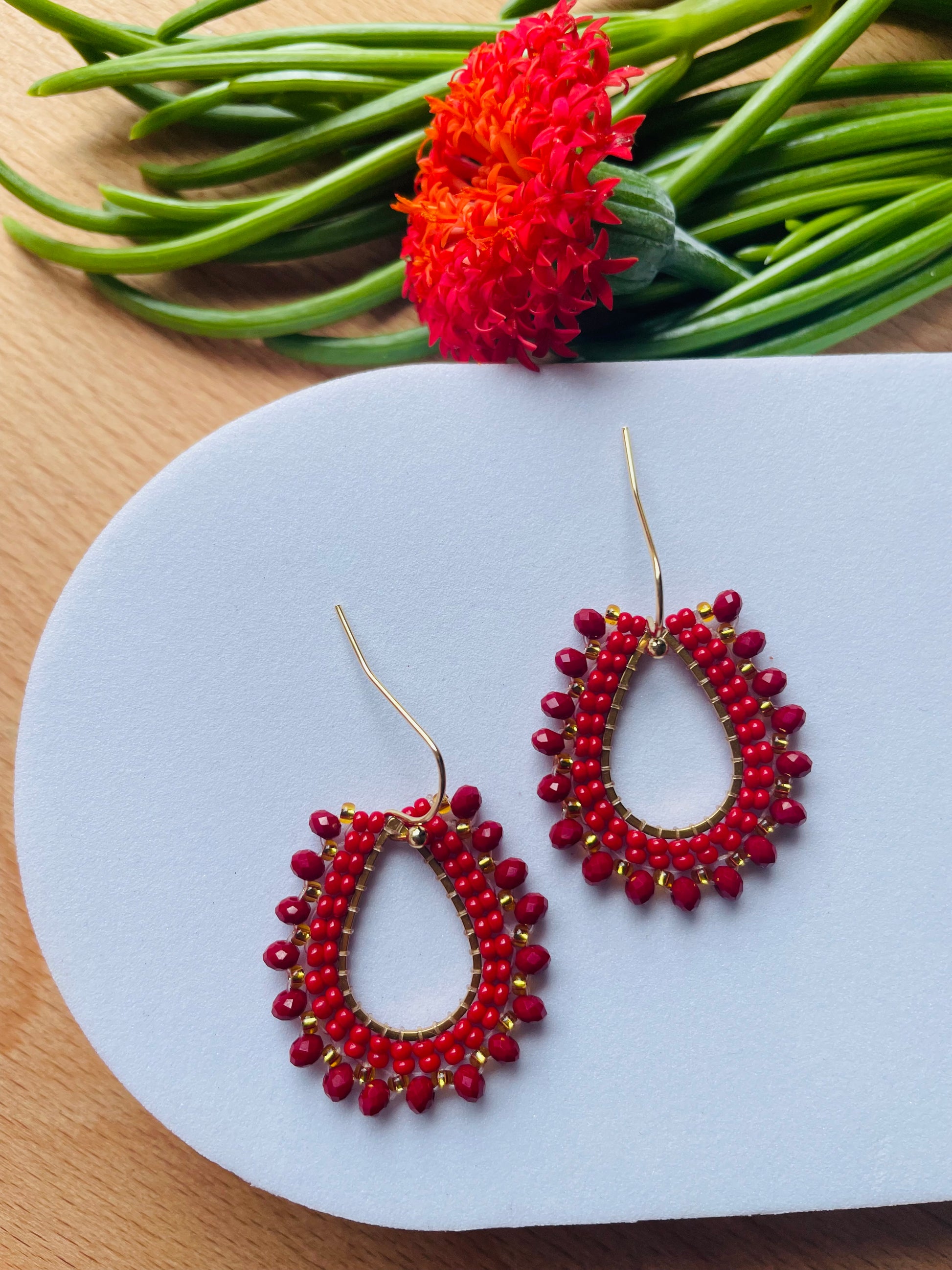 Bold, fiery and utterly captivating the Jill Earrings are designed to turn heads. Rich deep red beads are intricately woven with radiant gold accents, creating a look that feels both powerful and luxurious. These earrings carry an air of confidence and timeless beauty.