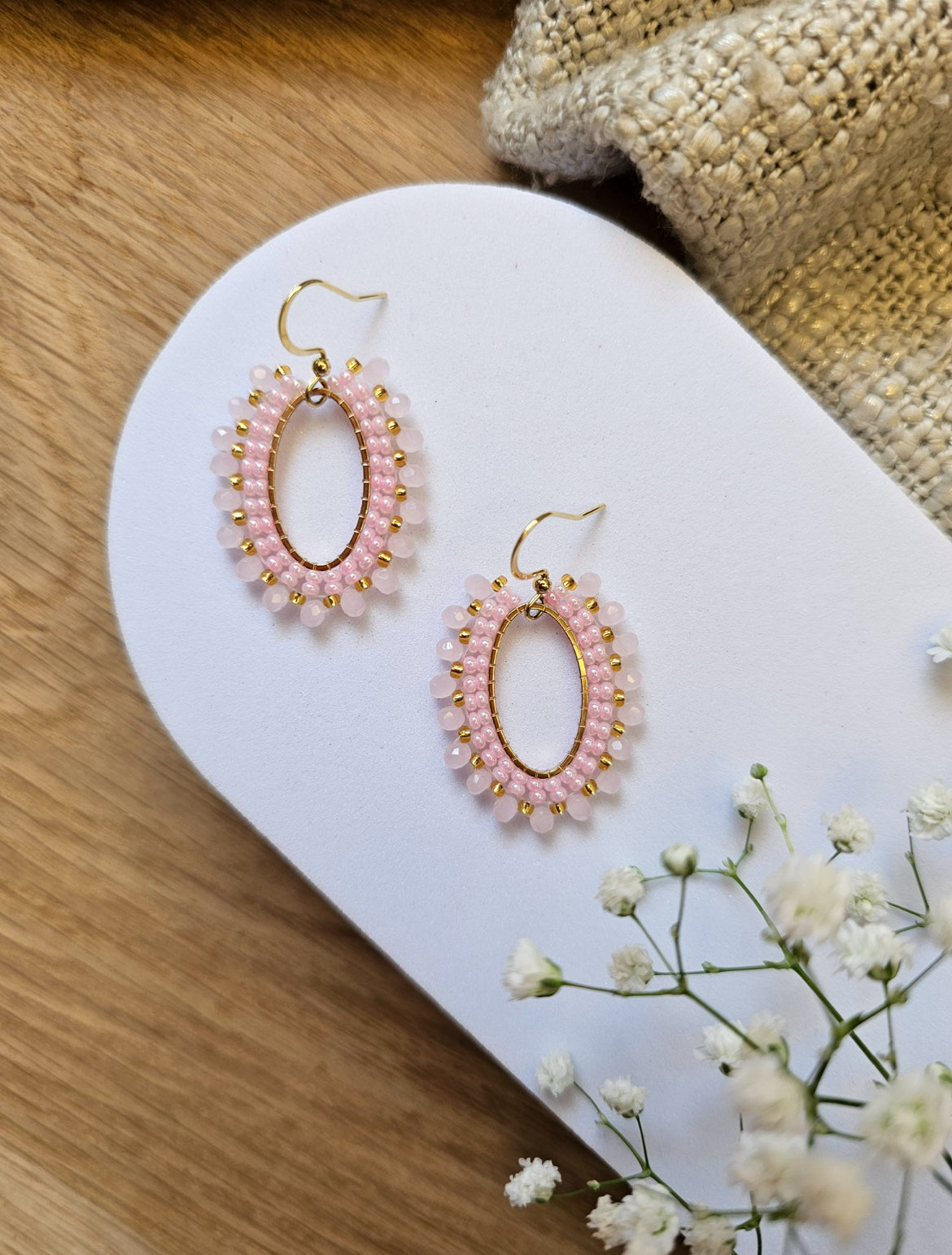 Subdued light pink glass beads bring this under stated and classy earring to life. With pops of gold glass beads this little piece is always a winner.