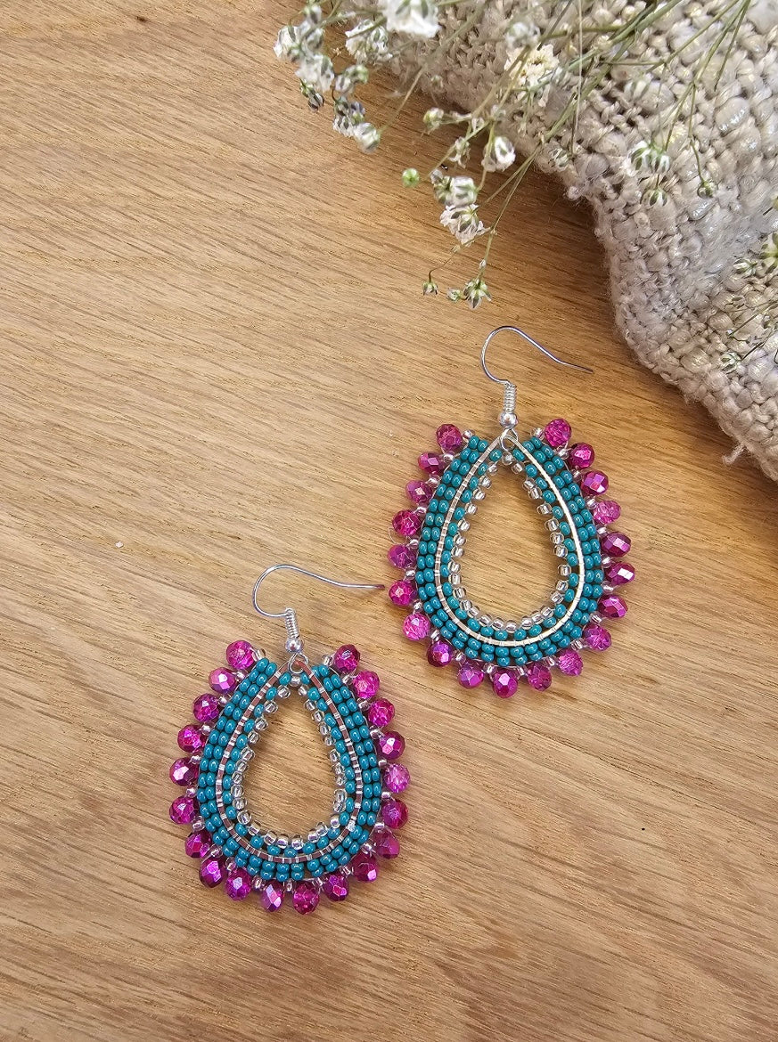 Be mesmerising in these earrings. Metallic cerise crystal beads with a splash of glossy dark turquoise glass beads.