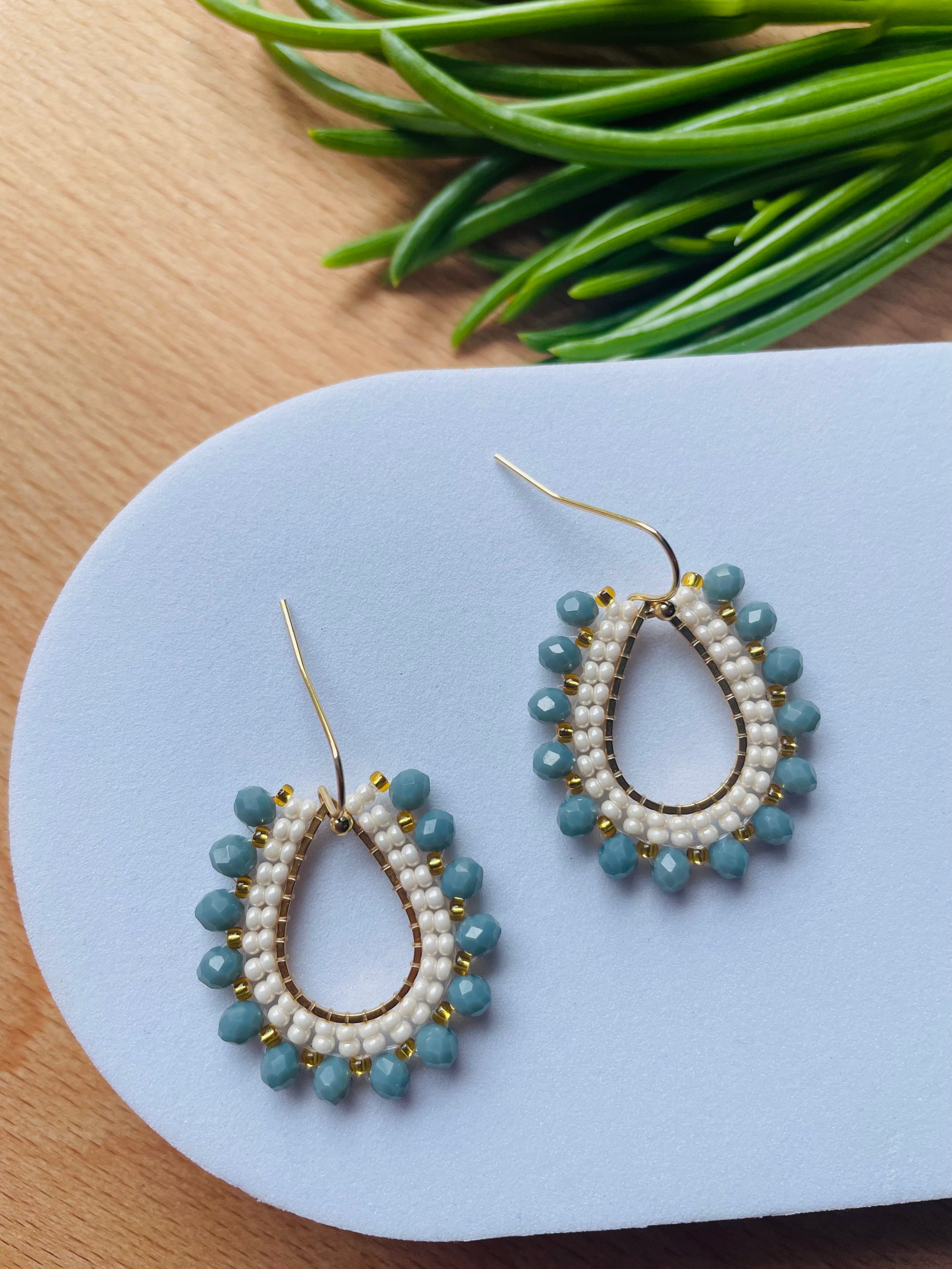 Classic colours for a classic look. Cream and gold seed bread with blue duck egg crystal beads make up this stunner. Neutral tones that can be combined with almost any outfit. Dress them up or down and be sure to sparkle.
