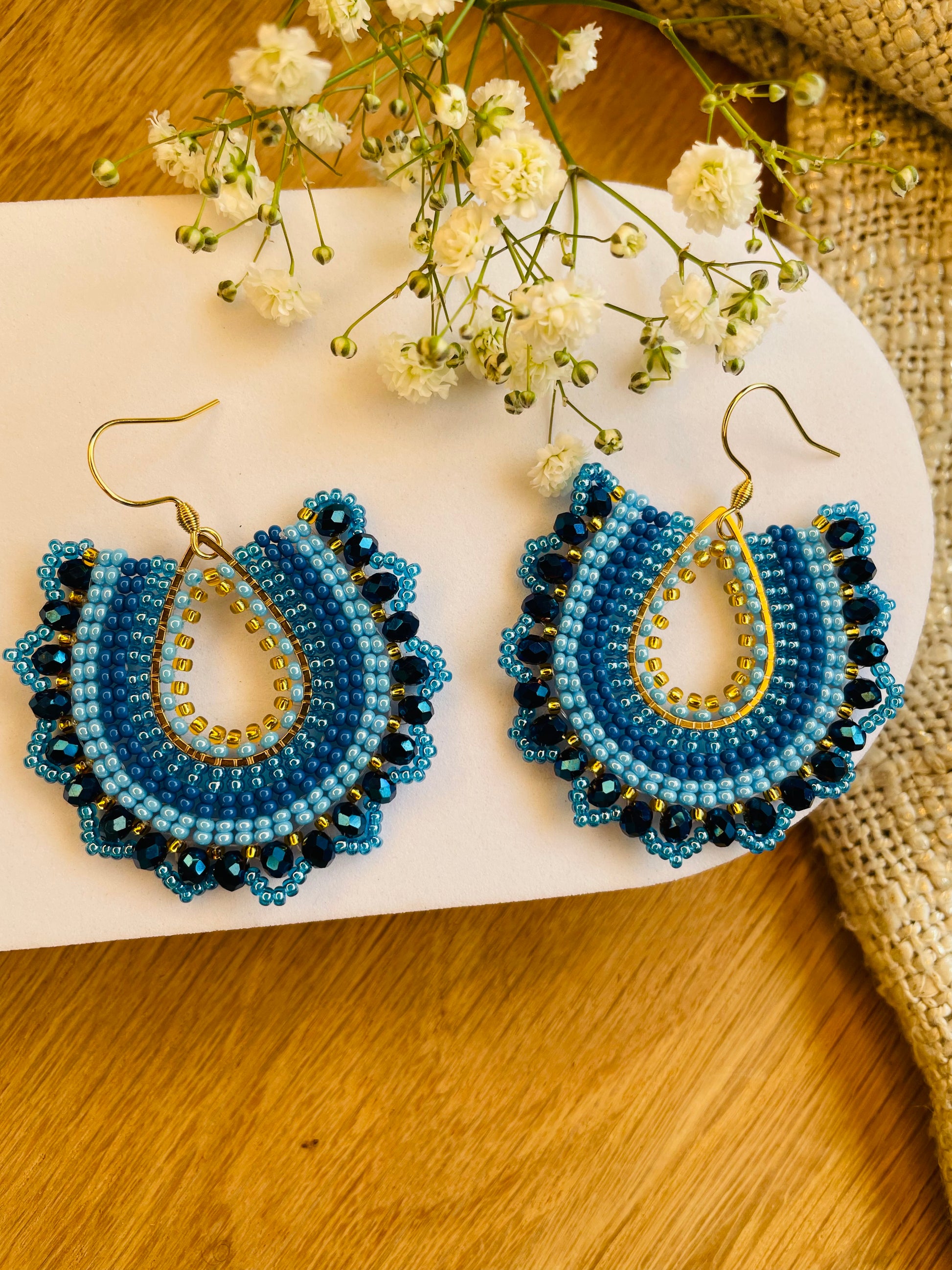 Big, bold, and full of flair, these statement beaded earrings feature layered shades of blue with a radiant splash of gold. Inspired by ocean depths and golden sunsets, they’re made to turn heads and elevate any look.