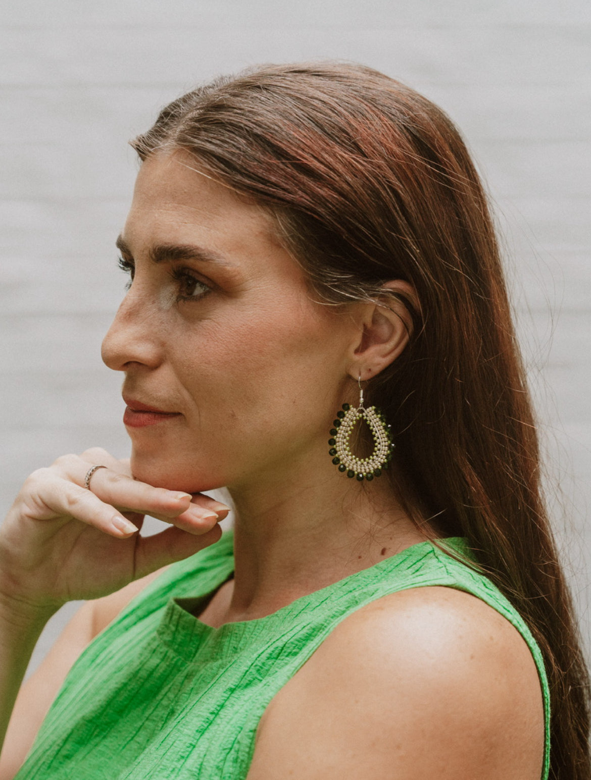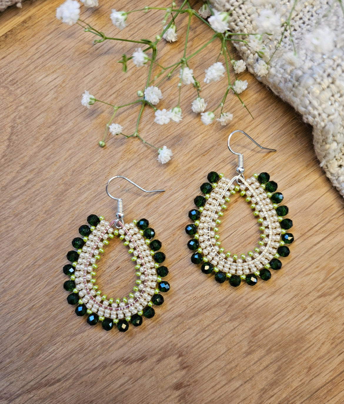 These elegant green and cream beaded earrings feature a delicate mix of soft, earthy tones. Perfect to add a touch of green to your outfit.