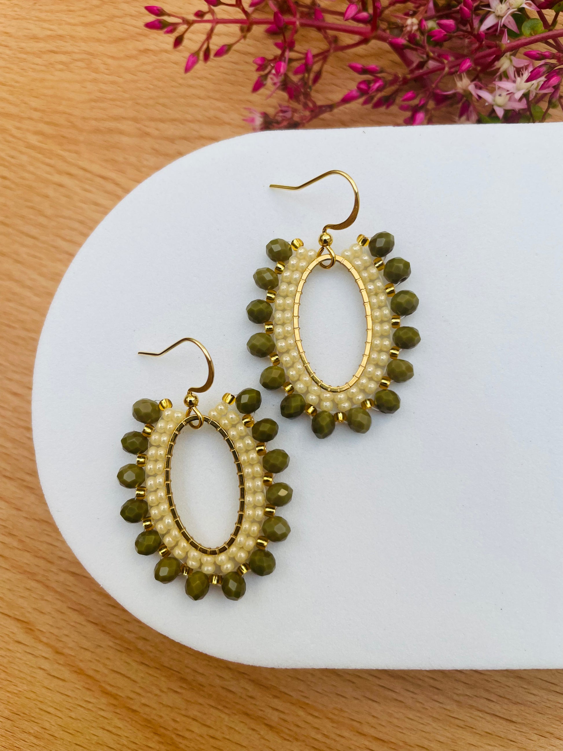 Elegant, earthy and full of charm these earrings are a true statement in subtle sophistication. Handcrafted with delicate custardy seed beads and framed by deep olive green crystal beads, these oval beauties are the perfect fusion of grace and edge.