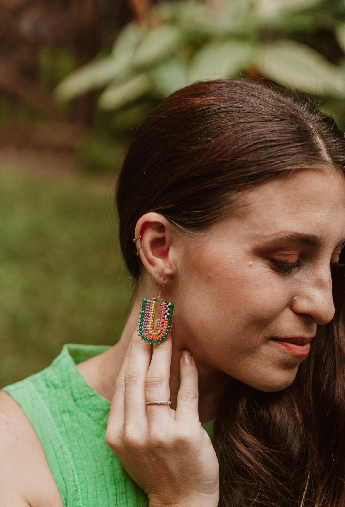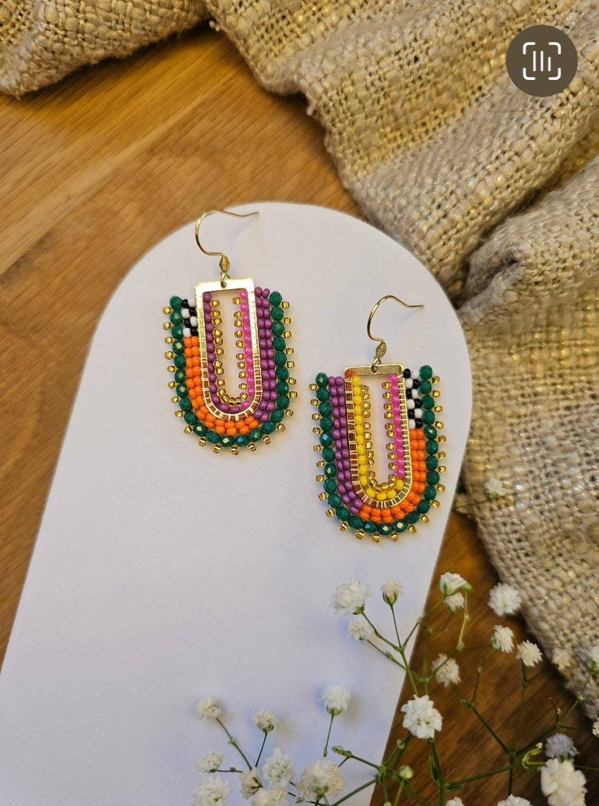 Trendy colour festival! This stunner consists of gold, orange, yellow, black, white, pink and matte purple glass beads topped with sparkling green crystals.