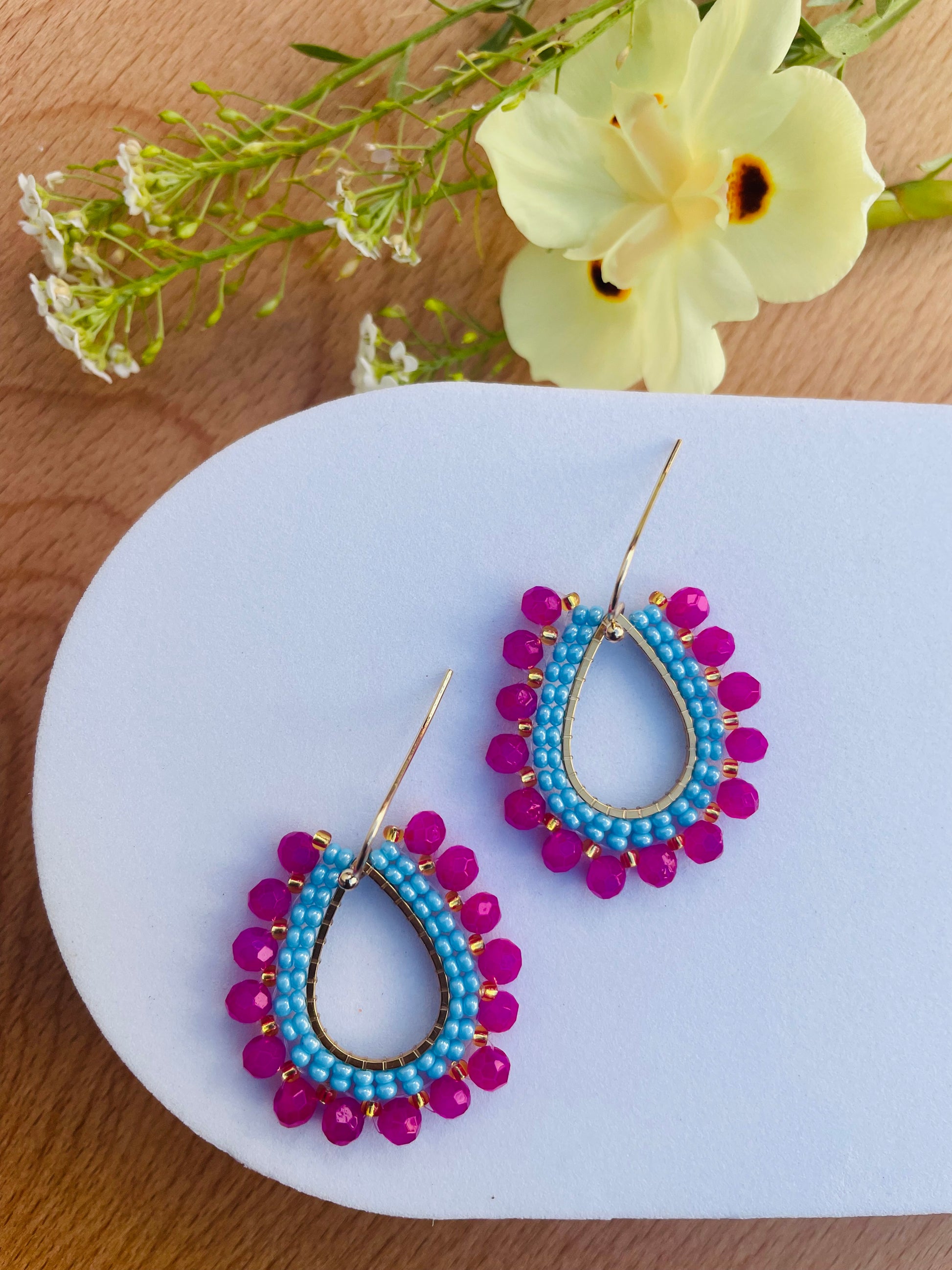 These teardrop earrings feature a striking mix of hot pink and sky-blue beads — light on the ears, big on personality. Perfect for adding a playful pop of colour to any outfit.
