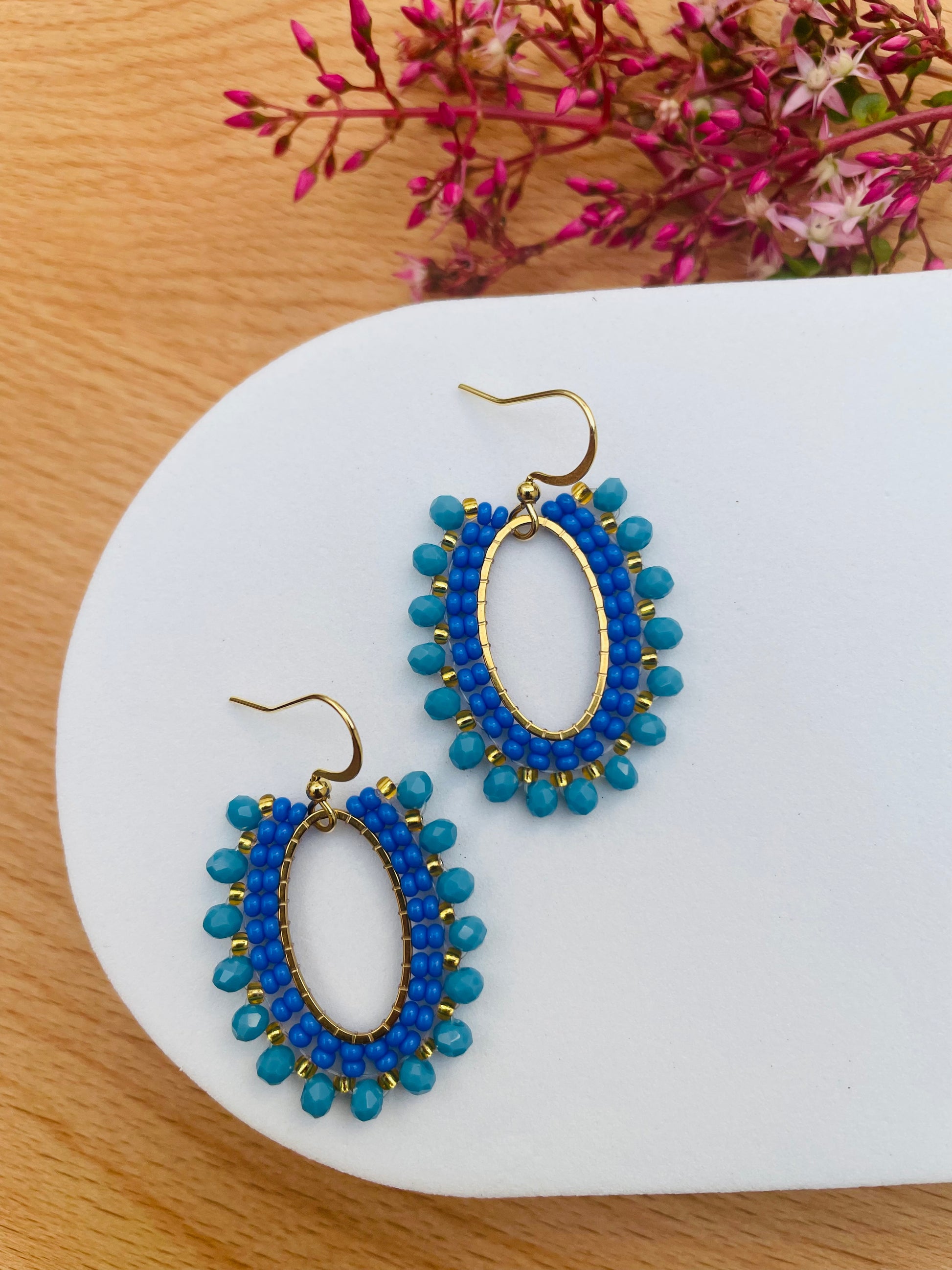 Bright, bold and bursting with energy the Sally Earrings are your instant getaway to sunny shores and endless blue skies. Featuring a striking mix of cobalt and dark blue seed beads, accented with shimmering gold details, these handcrafted earrings are a celebration of colour and confidence.