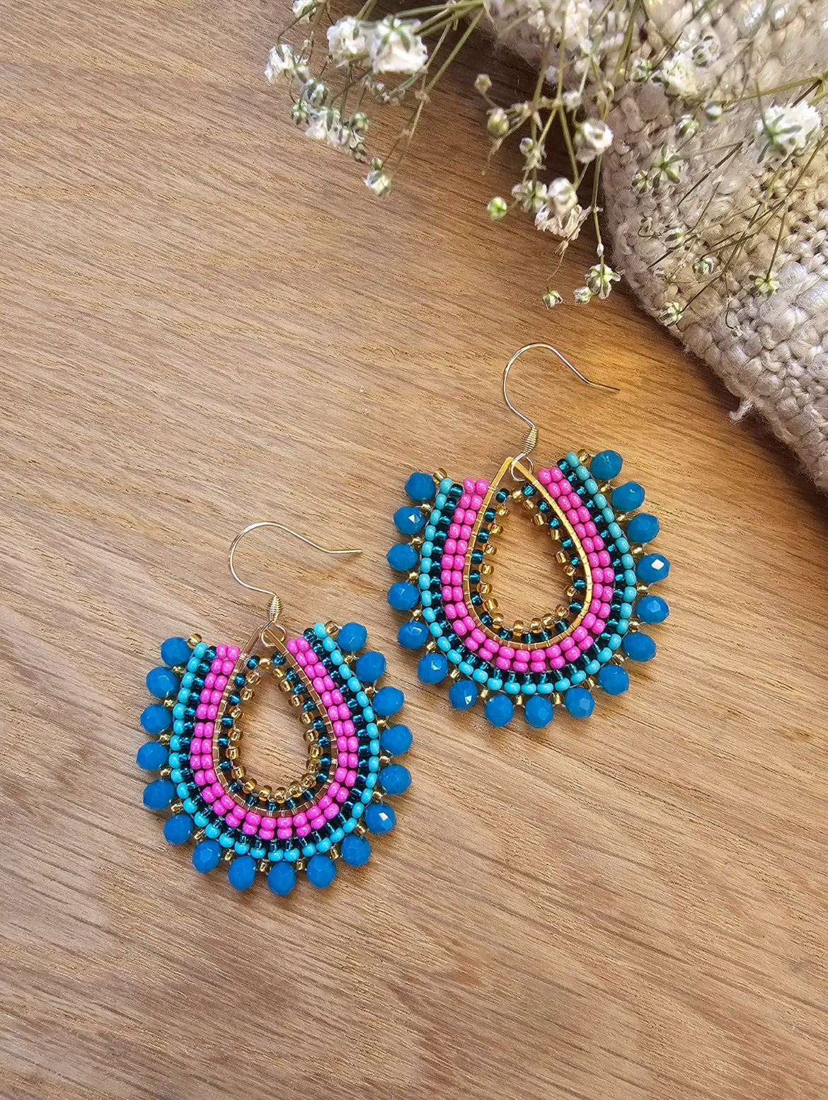 Cerise pink and blue glass beads.