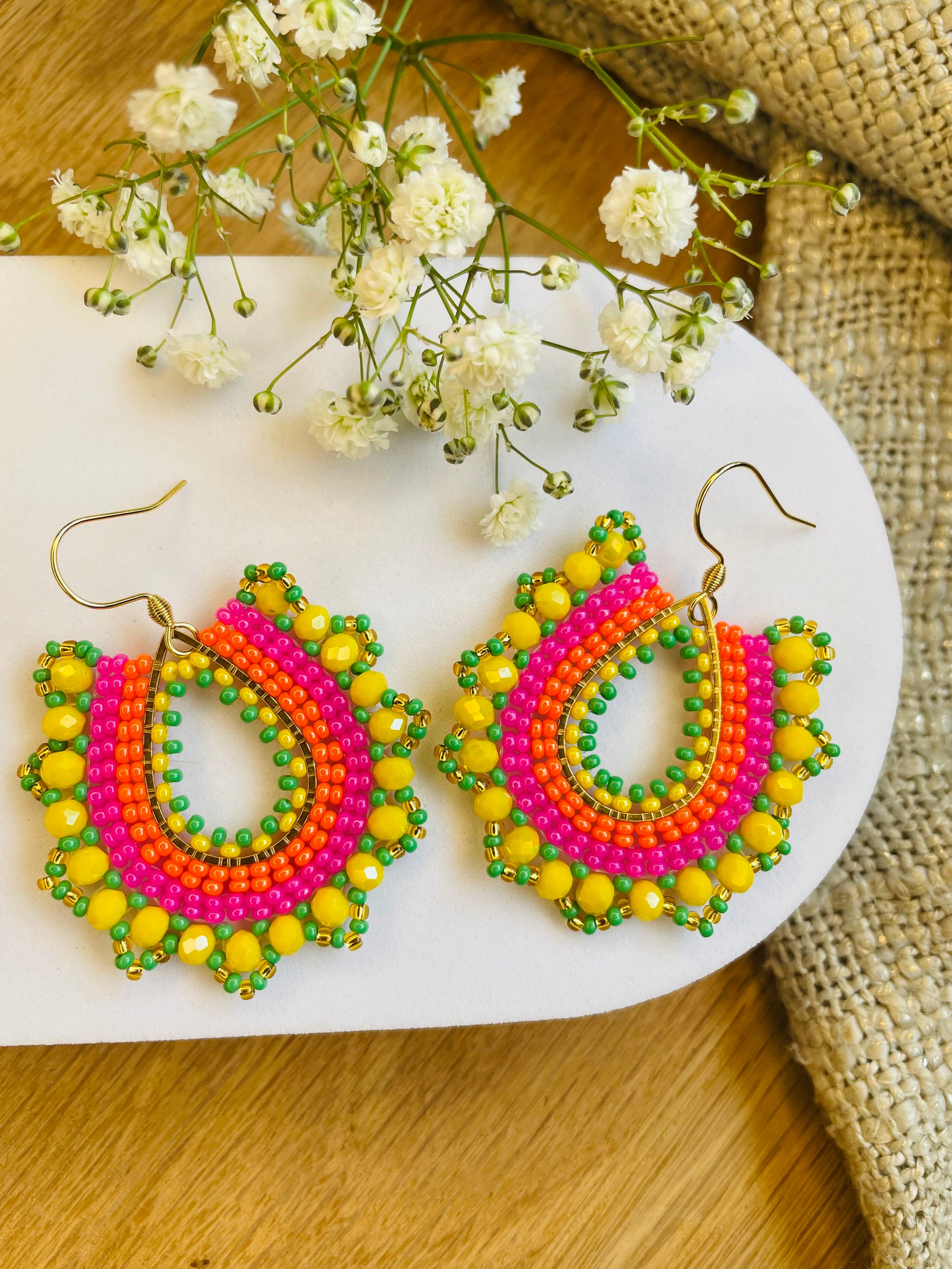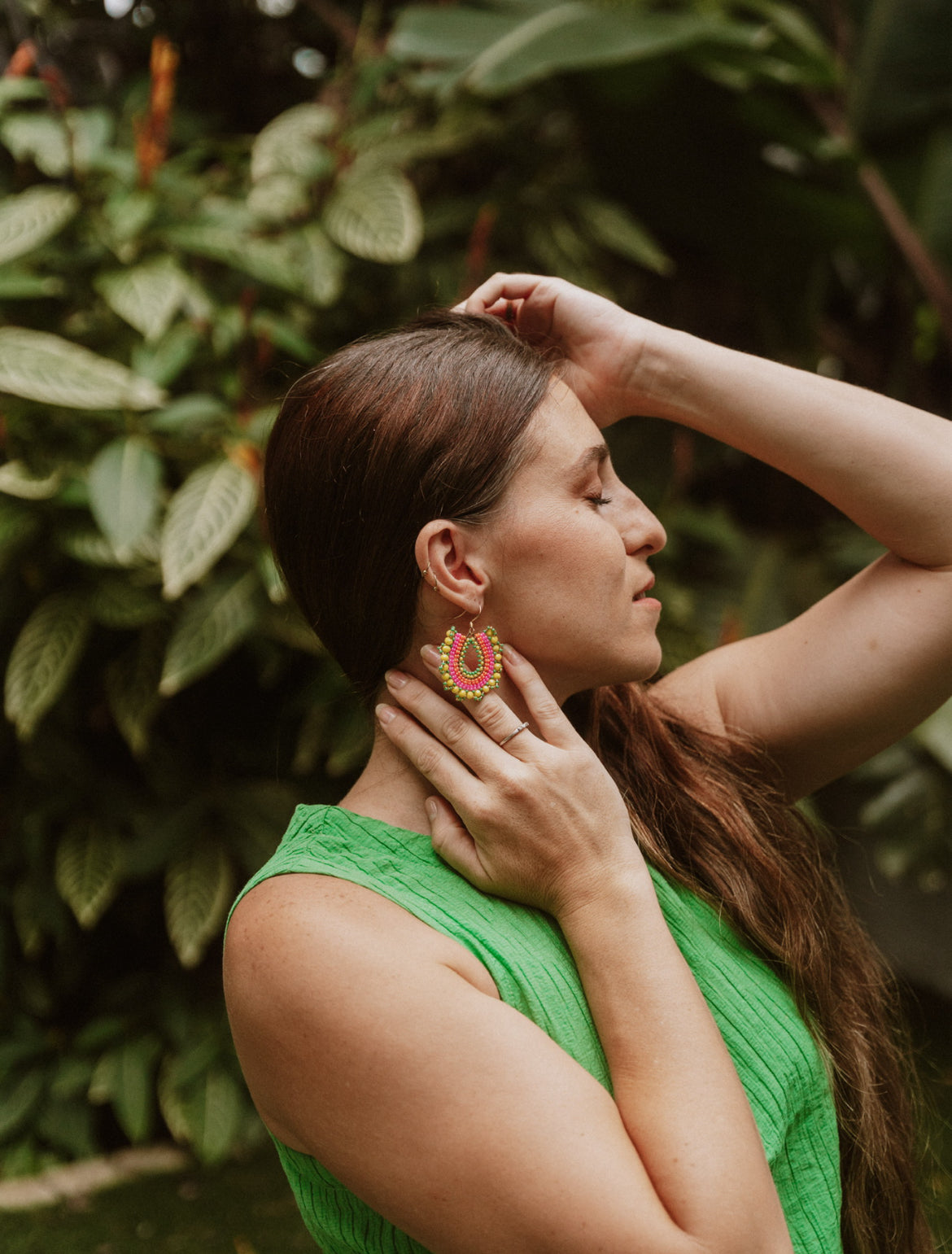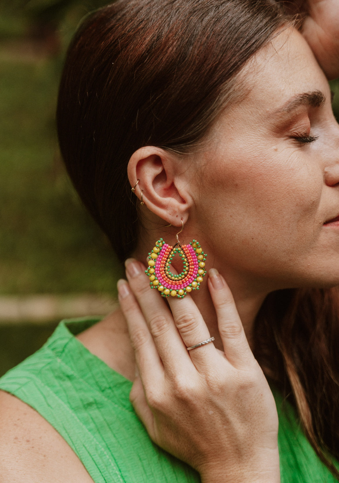 Perfect for vacation days or adding a touch of resort-ready charm to your everyday look. Bright and playful, these pineapple-inspired earrings blend sunny yellows, pearly oranges, tropical greens, and a splash of pink for a fun, fruity vibe.