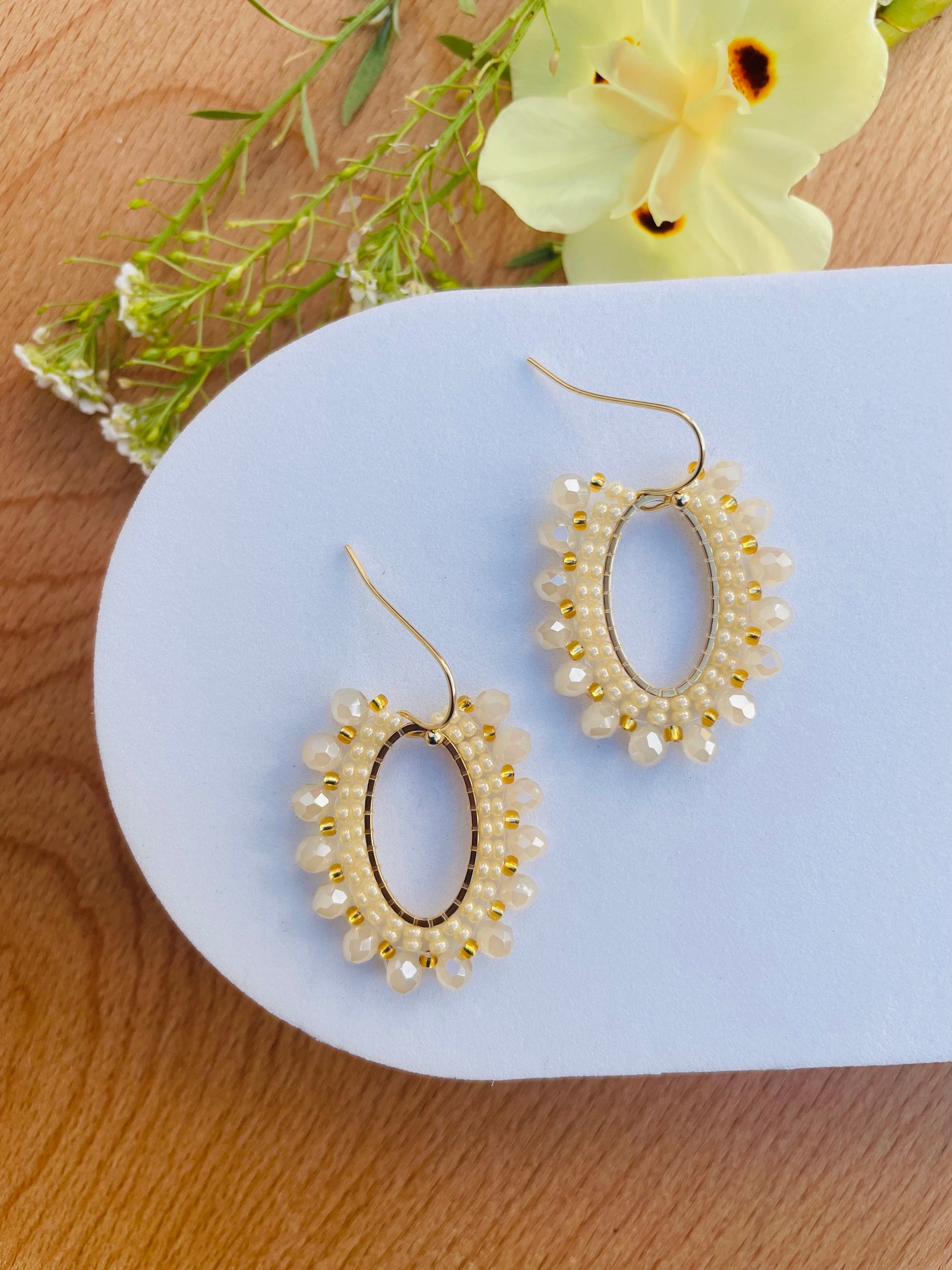 Handmade oval drops featuring soft cream crystals and gold accents elegant, lightweight, timeless.