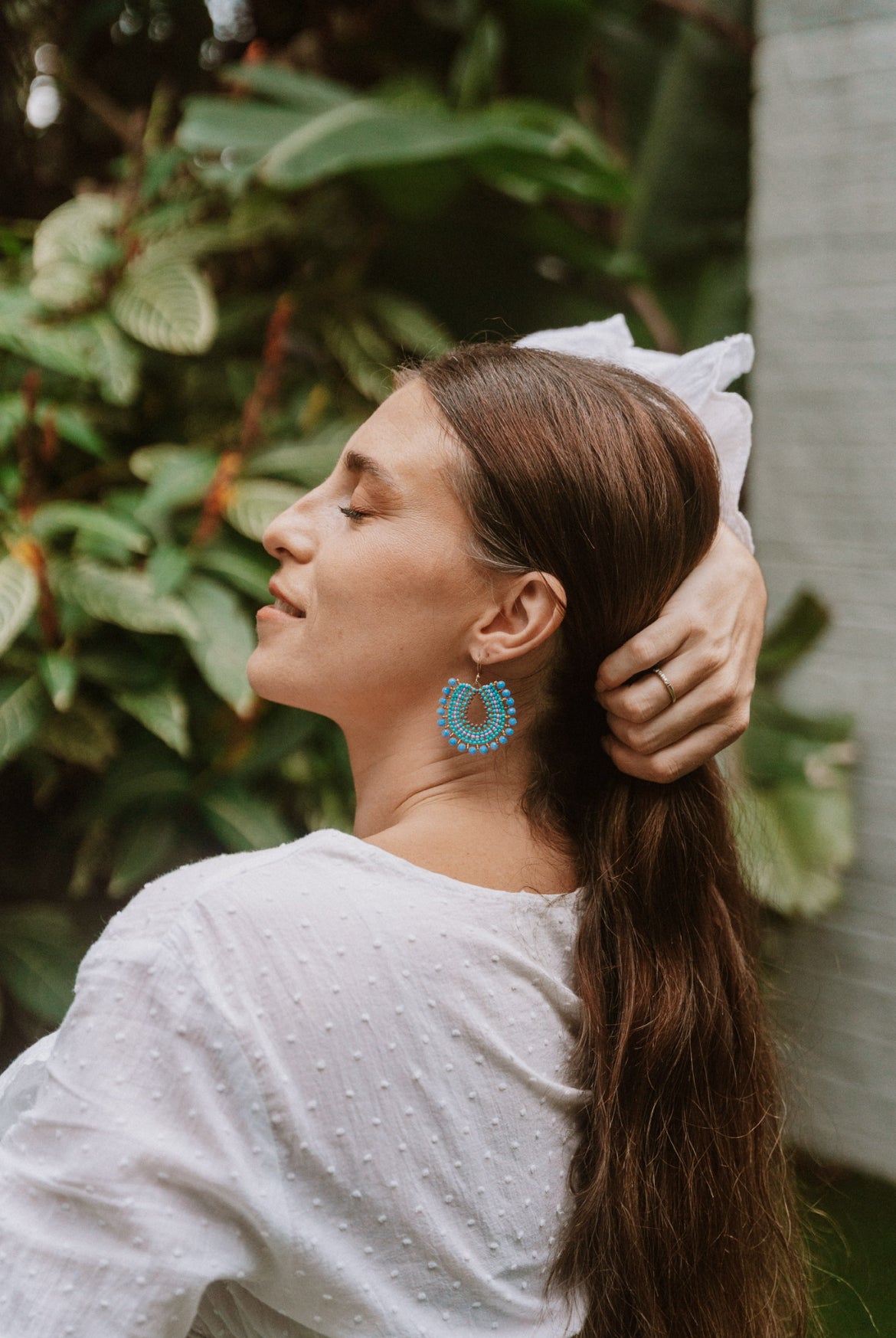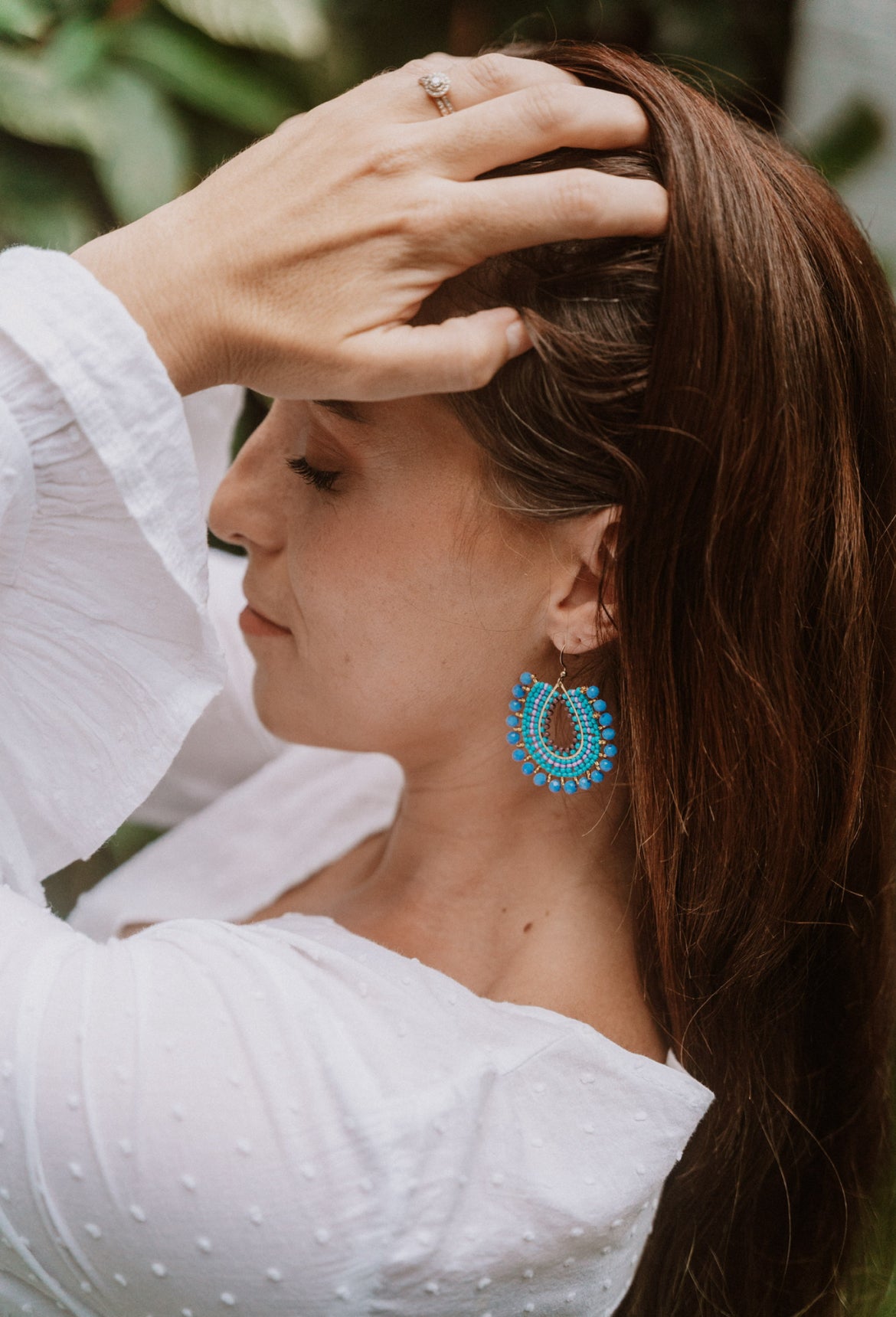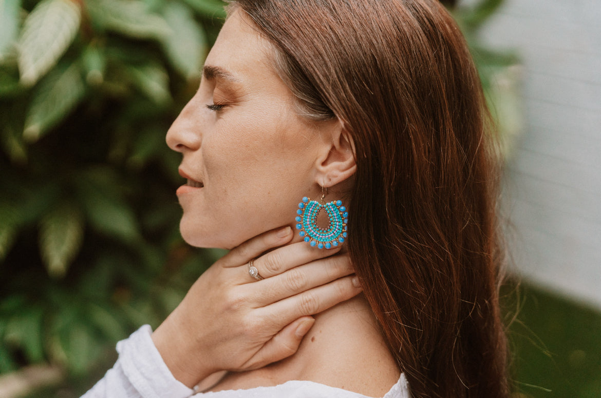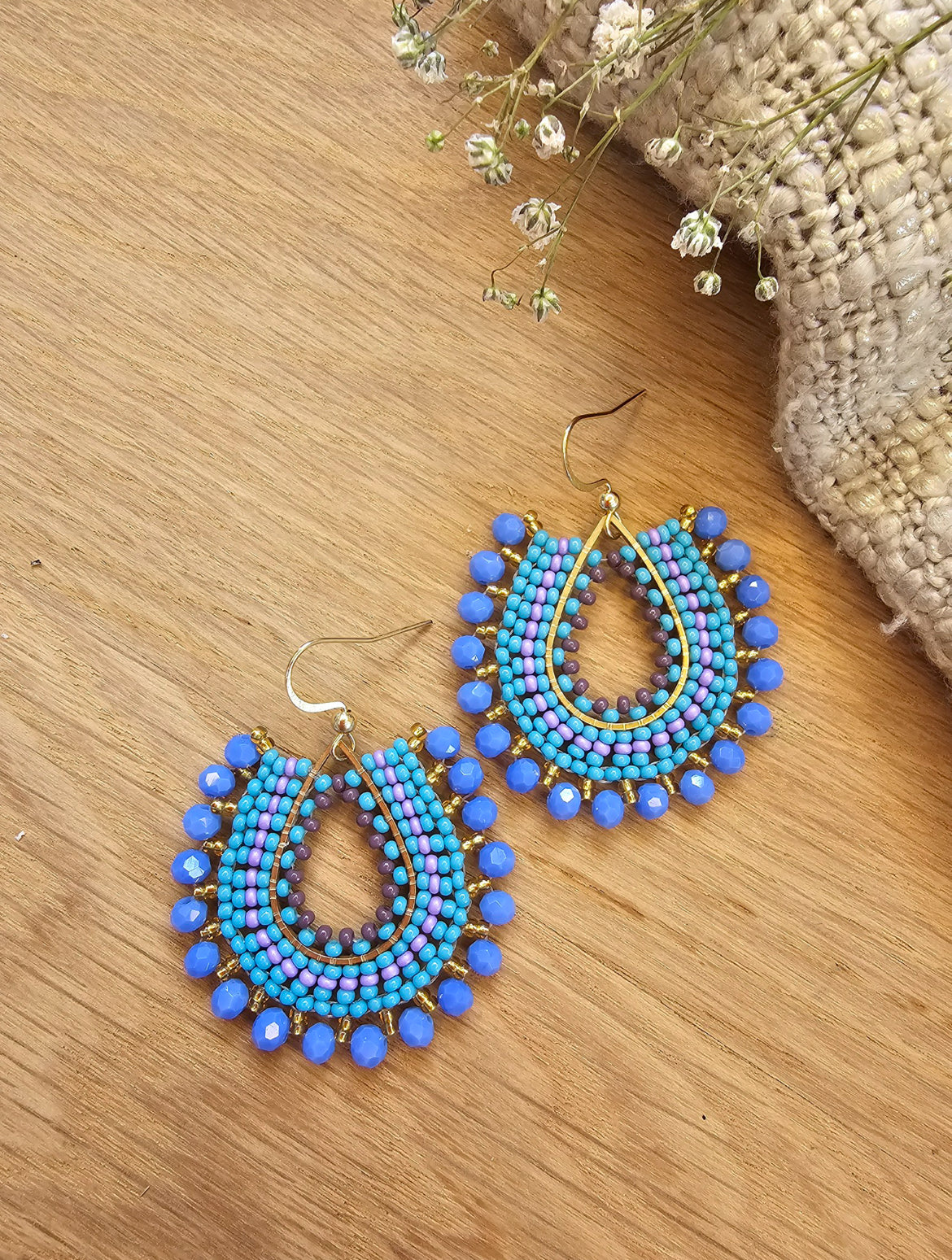 Soft hues, golden glow, dreamy and feminine. This exquisite earring is made of lilac, gold and a soft powder blue glass beads.